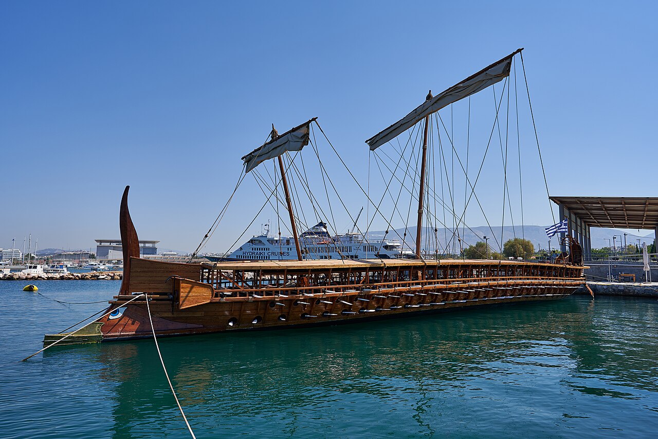 With no wrecks found some debated whether the trireme of ancient Greece was more marine myth than fact, but in 1987 one was built using plans developed by the retired Chief Naval Architect of the UK’s MoD, John Coates together with the vision of historian John Morrison, who first proposed a method by which vertical banks of rowers could row without snarling oars. Olympias was built by the Greek Ministry of Tourism and the Hellenic Navy signed on to build and conduct the sea trials. The boat had 170 oars with three banks of rowers and this video graphically shows the kind of conditions they and their ancient forebears had to row in. She even had a bronze 200kg bow-ram. The trireme was supposed to sustain seven knots at cruising speed and this was not possible with the Olympias according to reports. She was used for various occasions including bringing the Olympic flame to Piraeus, Athens, for the 2004 games. In need of a rebuild she was moved to a drydock at the George Averof Battleship Museum at Neon Faliron near Piraeus.